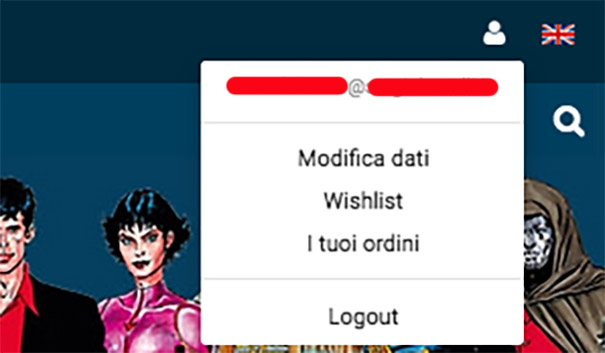 Una volta che il sistema vi avrà riconosciuto, nella barra in alto, passando il cursore sopra l’iconcina del mezzobusto potrete gestire il vostro profilo, scegliendo le voci Modifica dati, Wishlist e I tuoi ordini.