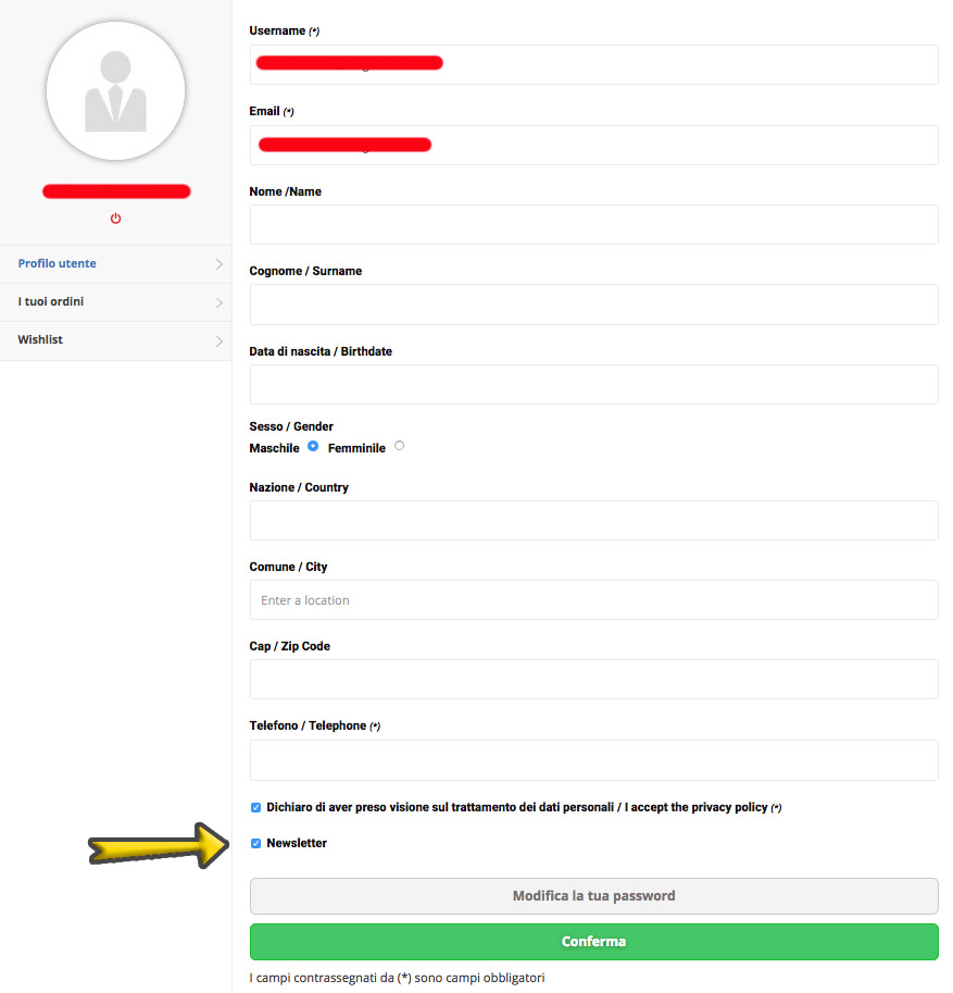 Scegliendo Modifica dati, passerete alla completa gestione del vostro profilo. Avendo inserito in precedenza i vostri dati e un indirizzo email di riferimento, non vi resterà che scorrere la pagina più in basso, fino a trovare la casella di attivazione della newsletter.