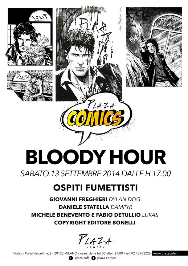 Secondo appuntamento del 2014 con Plaza comics, dopo quello primaverile. Questa volta tocca a Giovanni Freghieri, storico disegnatore dell’Indagatore dell’Incubo, Daniele Statella, new entry nella ciurma dell’Ammazzavampiri, e al duo di disegnatori di Lukas formato da Fabio Detullio e Michele Benevento – quest’ultimo anche co-creatore della serie, con Michele Medda, e copertinista – incrociare i calici e le matite.