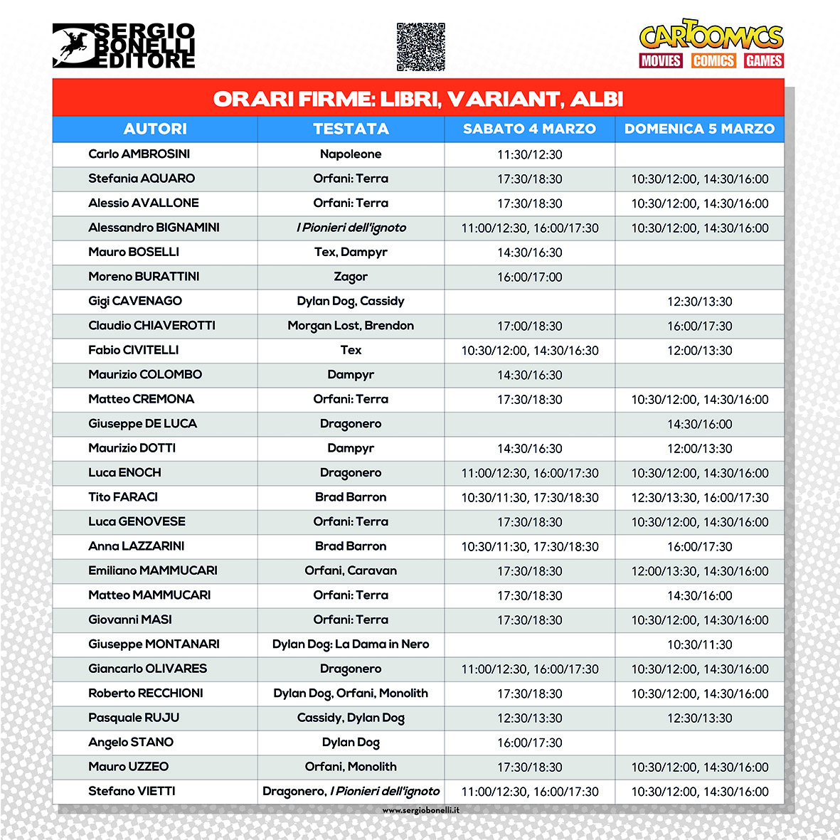 14:30/16:30 – Fabio Civitelli, Mauro Boselli Tex – Mauro Boselli, Maurizio Colombo, Maurizio Dotti Dampyr