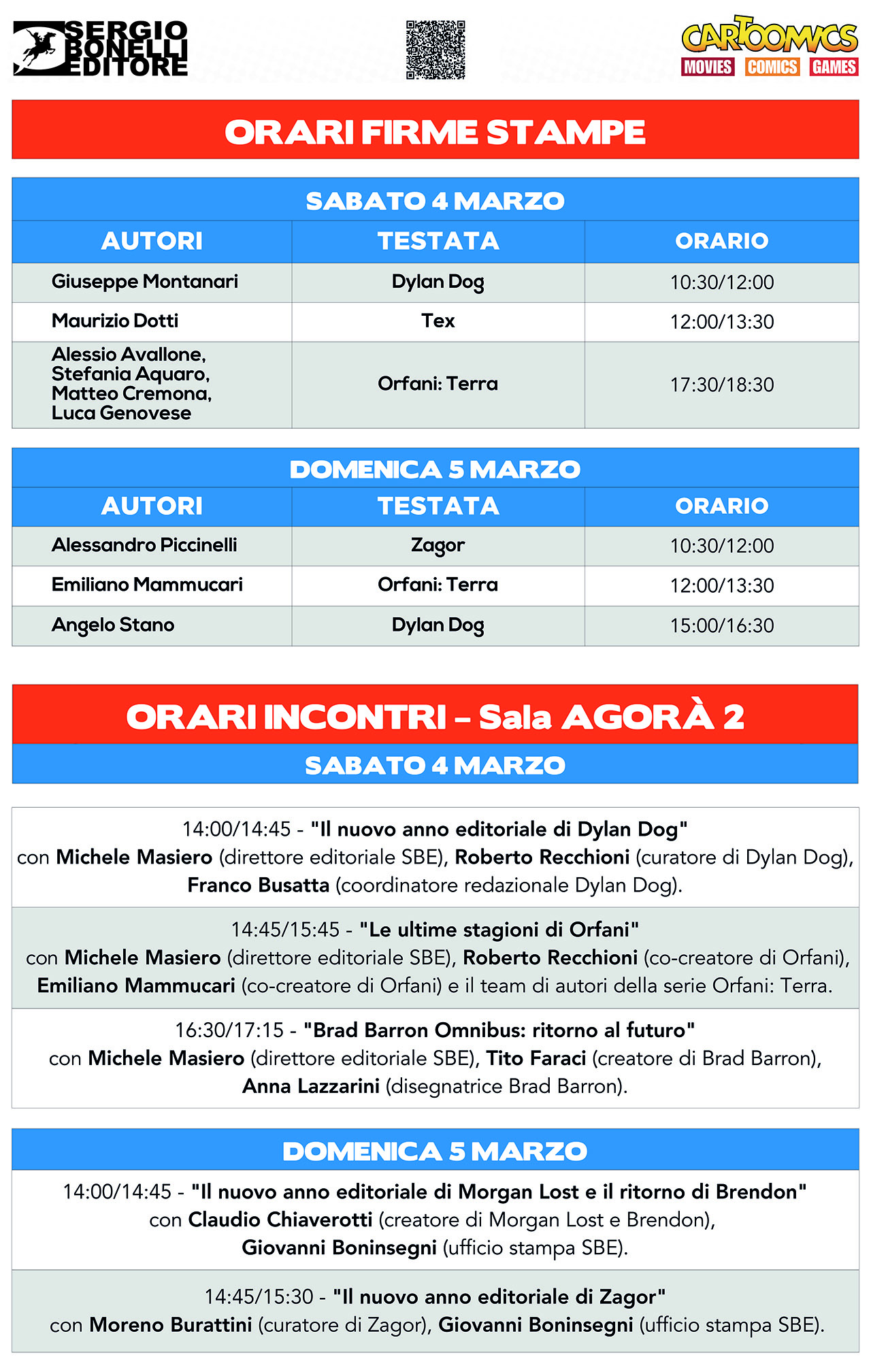 14:45/15:30 – “Il nuovo anno editoriale di Zagor” con Moreno Burattini (curatore di Zagor) e Giovanni Boninsegni (ufficio stampa SBE).