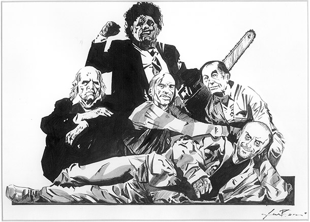 ![]() Maurizio Colombo in compagnia della poco rassicurante famiglia Hewitt, ritratti da Luca Rossi. |