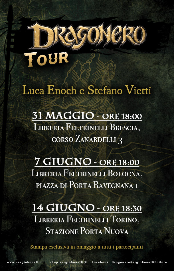 Si parte da Brescia, dove, giovedì 31 maggio, presso la Libreria Feltrinelli di corso Zanardelli 3, a partire dalle ore 18:00, Luca Enoch e Stefano Vietti presentano l’Atlante di Dragonero e “Oltre le tempeste”, n.61 della serie regolare interamente realizzato proprio da Enoch.