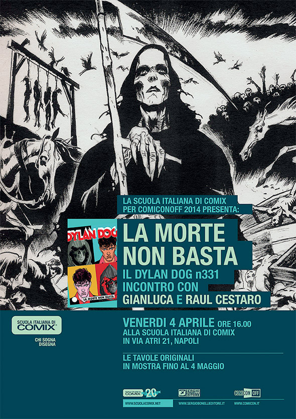 Gianluca e Raul Cestaro, autori dei disegni de “La morte non basta”, numero 331 di Dylan Dog, attualmente in edicola (cliccate qui per leggere la scheda e vedere due tavole in anteprima), saranno ospiti di un incontro con il pubblico, organizzato in occasione di Comiconoff 2014, il programma di mostre ed eventi che prepara al vero e proprio salone del fumetto partenopeo.