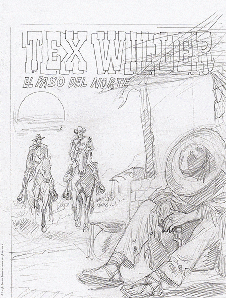 In questa pagina vi mostriamo il work-in-progress dell’illustrazione del numero 26, “El Paso del Norte“, in edicola dal 18 dicembre. Le varie vasi di lavorazione le potete vedere con calma nella gallery a inizio pagina, mentre qui sotto c’è una bella immagine animata che mostra la copertina che si compone pian piano.
