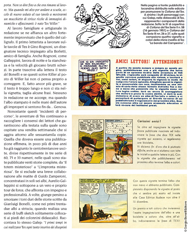 Un’ulteriore, notevole, evoluzione del concetto di figurina promozionale l’abbiamo agli inizi degli anni Cinquanta quando in quarta di copertina della Collana del Tex, a partire dalla serie II n.58 “Sul sentiero di guerra” (16 gennaio 1951), vengono pubblicate su ogni numero una o più vignette che, una volta ritagliate e rimontate, formeranno un episodio inedito a colori di Tex, intitolato “La Banda del Campesino”. La componente “agonistica” dell’iniziativa è che le vignette non sono pubblicate nella sequenza di lettura e i lettori dovranno ridisporle “nel loro logico ordine. Sarà un lavoro di sceneggiatura che metterà alla prova la vostra abilità […] e vi permetterà di partecipare al Grande Concorso di cui pubblicheremo il regolamento nel prossimo albo. Questo concorso oltre a essere altamente educativo vi farà vincere dei bellissimi premi”. Quando si dice: unire l’utile al dilettevole!