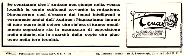 Il secondo rinnovamento di Bonelli consiste nel trasformare il giornale in un albo, un contenitore più moderno e gradito ai giovani. Ma la chiave di volta per raggiungere il successo è la terza mossa: fidelizzare i lettori attraverso una pioggia di concorsi a premi, mettendo in campo tutto l’arsenale che il marketing ante litteram dell’epoca permette. Il proposito è chiaro fin dal primo editoriale firmato come editore: “Frattanto la Direzione sta studiando il modo per poter premiare gli assidui e affezionati lettori […]. Non mancate di comprare sempre l’Audace. Una mancanza, un solo numero non acquistato potrebbe significare l’impossibilità a concorrere poi alla vincita dei premi messi a disposizione dei lettori del giornale”. Suona quasi minaccioso ma, in realtà, per intessere un rapporto proficuo e duraturo con gli acquirenti, Bonelli assume la figura bonaria di “Nonno Audace“. In questa veste dà vita a una rubrica della posta intitolata “Radio Audace”, che prenderà sempre più piede tra i lettori, gratificati dalle risposte spiritose del “Nonno” e dalla pubblicazione delle loro fotografie, che inviano in redazione sempre più numerose. Il cerchio si chiude con Audace n.348 del 31 maggio 1941, nel quale viene annunciata la nascita della Tessera Audace, il raccoglitore di “bollini” cartacei con il quale il lettore può certificare l’assiduità nell’acquisto della testata.