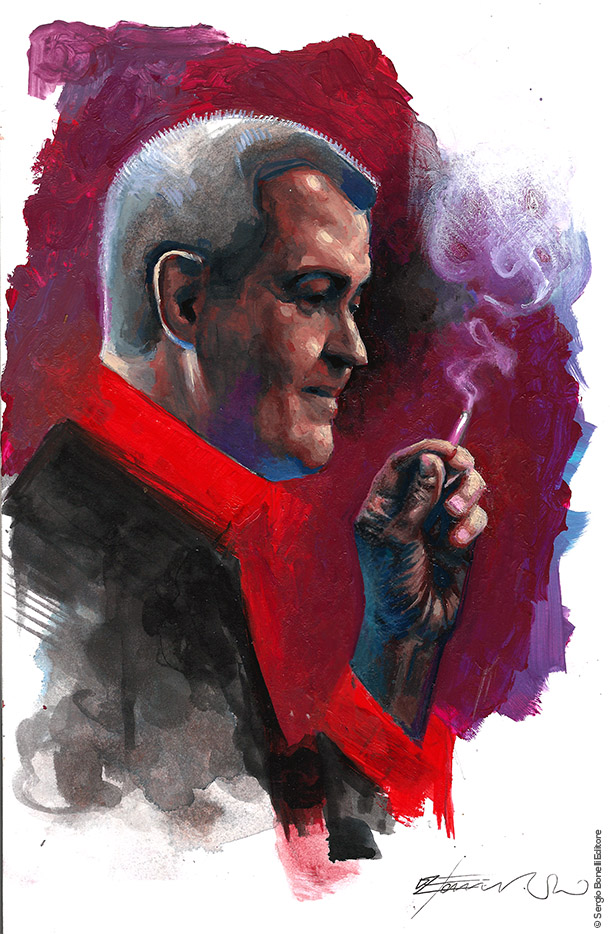 Tiziano Sclavi è il sogno proibito di ogni disegnatore. È alto due metri per 115 kg di muscoli ben rodati. Con un battito cardiaco regolare anche sotto sforzo. Gli ho visto sollevare un cavallo a mani nude. Ho sentito dalla sua voce mirabolanti racconti di vite impossibili. Di incontri e amori. È un perfetto affabulatore e sa preparare dei cocktail eccezionali. È un grande conquistatore, nessuno gli resiste. Tiziano Sclavi è lo sceneggiatore definitivo.
