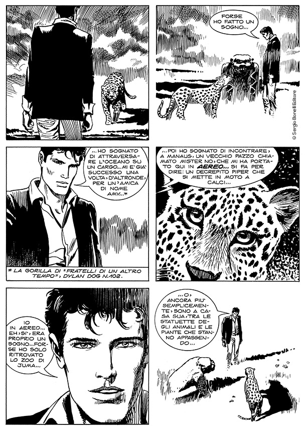 Quel nome bizzarro mi fece scattare qualcosa. Non avevo mai sentito parlare di lui, che in Europa era piuttosto famoso, eppure mi sembrava di conoscerlo da tempo. Sentivo una inspiegabile affinità con quello sconosciuto. Chiesi a Martin di tenermi informato sulla faccenda, e lui qualche tempo dopo mi chiamò per dirmi che il caso era definitivamente risolto. A quanto pare, Ananga era arrivato a Londra attraverso un giaguaro catturato nella foresta amazzonica e poi venduto a un circo. Lì lo Spirito del Male aveva trovato un ospite umano, diventando il killer dell’artiglio: pane per i denti di Dylan Dog, l’Indagatore dell’Incubo. Nella vicenda erano coinvolti un clown triste, un mago cialtrone e una bella trapezista. Alla fine Dylan aveva consegnato alla polizia il vero colpevole, che è sempre anche una vittima, e aveva preso in sé lo Spirito del Male riportandolo qui, in Amazzonia. Martin mi ha detto che non sa come il suo amico abbia varcato l’oceano, visto che ha la fobia di viaggiare in aereo. Io non ho ritenuto opportuno raccontargli del mio incontro con un giovane in abiti cittadini – giacca nera, camicia rossa e Clark’s ai piedi – arrivato fino a Manaus con un lunghissimo viaggio in cargo, che mi aveva costretto a tirar fuori dall’hangar il mio decrepito Piper e a condurlo proprio nel luogo dove avevo incontrato Ananga. Insomma, quel tizio sul mio aereo non avrebbe dovuto salirci, no? E il mio Piper come ci è atterrato in mezzo alla giungla? No, credo davvero che questo mio incontro con un giovane londinese ombroso e taciturno sia una fantasia, o meglio un altro delirio causato dall’abuso di alcol.