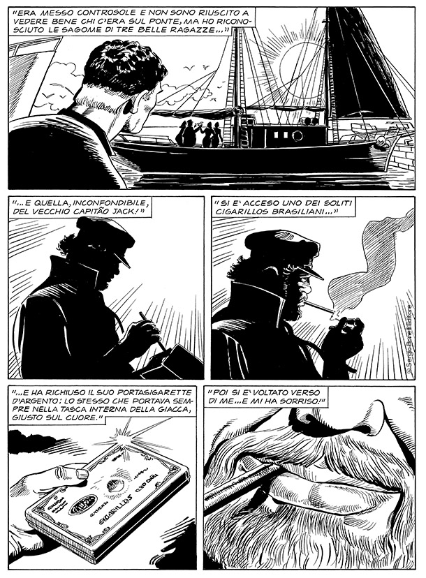 A Shangai Jack piaceva fare il misterioso. Durante il viaggio passammo a trovare un’altra amica, la sacerdotessa del candomblè Mãe Satanhia, e lui si fece restituire una statuetta di Iemanjà che diceva essere il suo portafortuna, ma secondo un matto russo che ronzava nei dintorni era “il tesoro di Capitão Jack”. In realtà quella banale immagine di terracotta nascondeva un teschio di Tetzalipoca, antico reperto archeologico dai misteriosi poteri (o forse un falso ottocentesco…) che lui vendette al mercante Amerigo Schwartz per un discreto gruzzolo. I soldi li usò per comperare certa merce da Rajiv Danieli, pirata e contrabbandiere mezzo indiano e mezzo veneziano, un vecchio amico (che però prometteva di ammazzarlo, un giorno o l’altro, e sembrava abbastanza pazzo da poterlo fare davvero). Si erano conosciuti quando entrambi erano “gentiluomini di ventura” sul Pacifico. Le casse della “merce migliore” di Rajiv che prelevammo dalla sua nave “L’amor degli amici” pesavano troppo per contenere alcolici. Durante il viaggio di ritorno, Jack mi rivelò che erano fucili destinati ai pescatori di Praia Grande per difendersi da Moureira che esercitava un potere feudale su di loro. Non arrivammo mai a consegnare la merce. La Nina G. fu intercettata da Uriaga e dai suoi scagnozzi, Shangai Jack prima di finire in fondo all’Atlantico crivellato di proiettili riuscì a spingermi fuori bordo.