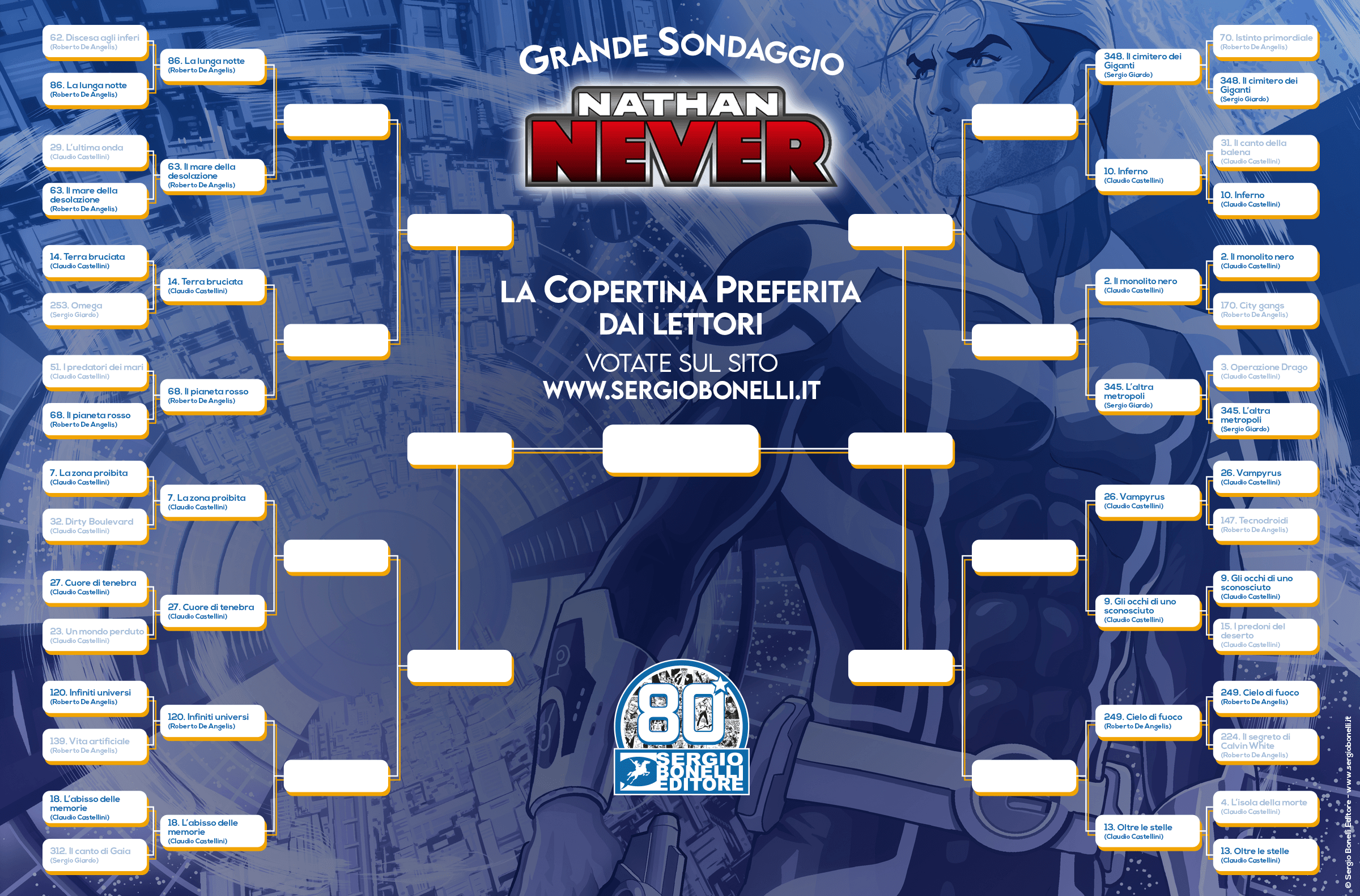 Dopo quattro mesi siamo ormai nel viso della fase a eliminazione diretta del grande sondaggio che eleggerà la copertina di Nathan Never preferita dai lettori tra le prime 360 della serie regolare dedicata all’Agente speciale Alfa. Questa settimana potete votare per le seconde otto sfide dei sedicesimi di finale, assegnando il vostro voto alla copertina che preferite per ogni coppia, una volta sola. Se siete indecisi su quale merita la vostra preferenza, ricordate che potete ingrandirle cliccando l’immagine.