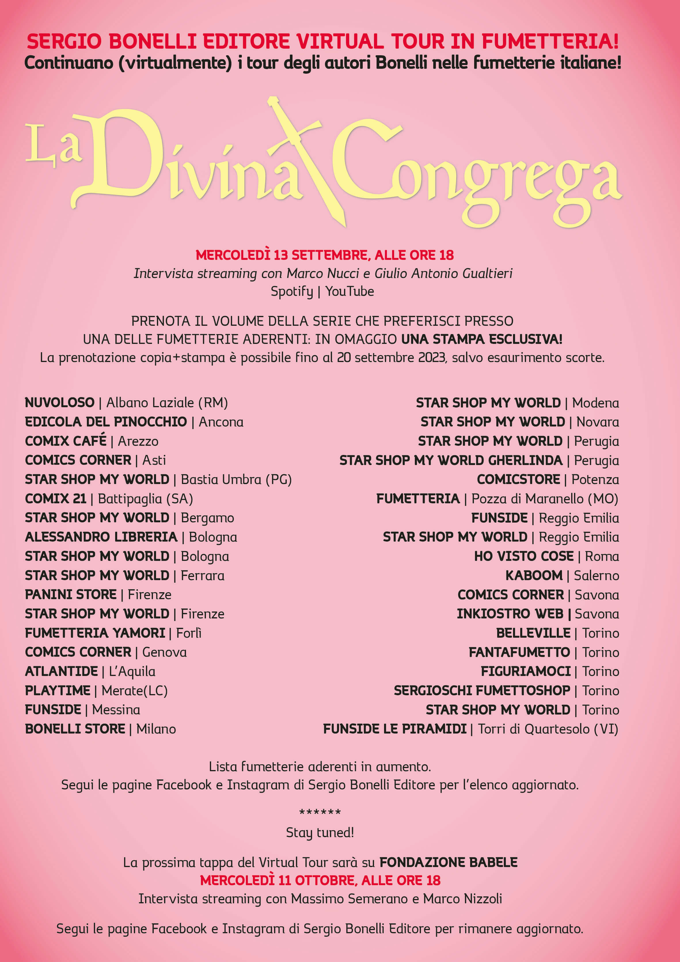 Se non volete perdervi nessun aggiornamento riguardo La Divina Congrega, seguite la pagina Facebook dell’etichetta Audace. Per rimanere aggiornati su tutte le novità della nostra Casa editrice, potete seguire la pagina ufficiale di Sergio Bonelli Editore su Facebook o su Instagram, iscrivervi al nostro canale YouTube o alla newsletter settimanale. Se invece volete ascoltare il nostro podcast, potete farlo sulla vostra piattaforma preferita partendo da questa pagina.