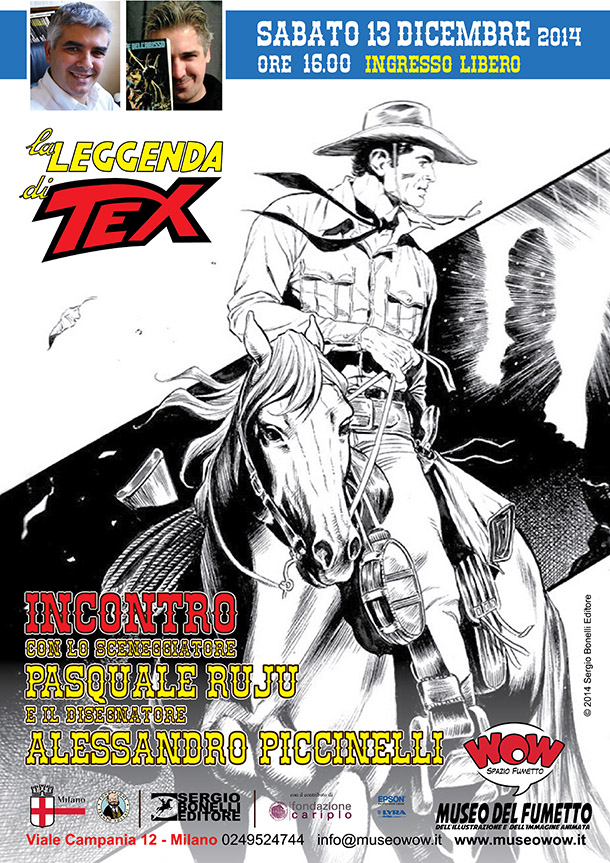 Con l’occasione, sarà possibile visitare la mostra “La leggenda di Tex” (che rimarrà in cartellone fino al 18 gennaio 2015), che vede in esposizione più di 200 tavole originali del maestro Aurelio Galeppini, inventore grafico del personaggio creato da Gianluigi Bonelli.