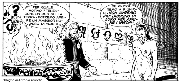 L’ultimo racconto di questo quinto volume, “L’ombra dei grifoni”, vede il ritorno del segno elegante ed espressivo di Antonio Amodio: le sue pennellate e la caratterizzazione dei personaggi, oltre alla capacità di evidenziarne la “recitazione” e a una certa passione per l’art nouveau dell’illustratore Alphonse Mucha, lo avvicinano a un autore statunitense molto amato negli anni 90 e ancora oggi sulla breccia, Adam Hughes. Il Nostro lo ritroveremo, nel periodo successivo alla conclusione di Elän (che vi presenteremo nel 2023), dapprima alle prese con Jonathan Steele, quindi con Demian, eroe protagonista di una miniserie creata da Pasquale Ruju nel 2006 e proseguita, con alcune uscite speciali, fino al 2012.