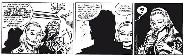 Il Corriere d’Informazione aveva cominciato a dare un po’ di spazio ai fumetti nel 1975, e aveva prodotto alcune serie, tra cui Valentina di Guido Crepax. Per quel giornale, scrissi e curai una versione a strisce di Diabolik. Alcune storie erano realizzate apposta per il quotidiano; altre, invece, erano costituite da rimontaggi degli albi, rielaborati a tal punto da divenire storie nuove. A parte i cambiamenti determinati da esigenze pratiche (vignette ristrette o ampliate, dialoghi adattati per l’occasione), i racconti per i quotidiani impongono una specifica sintassi applicata. Sono infatti costituiti da puntate molto brevi, diluite in un vasto arco di tempo, e molti lettori cominciano a leggerle quando la vicenda è già iniziata. Per sperare di catturarne l’attenzione, è necessario, quindi, aprire ogni tavola con una vignetta dalla quale sia possibile desumere, anche se vagamente, cosa sta succedendo. La sequenza dev’essere chiusa da un momento di suspense per indurre a proseguire la lettura.