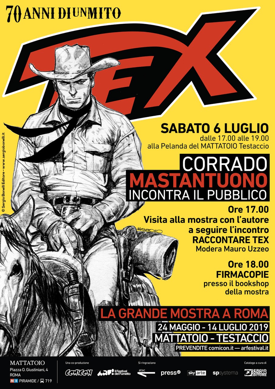 L’edizione romana della grande mostra Tex 70 anni di un mito prosegue presso il Mattatoio Testaccio di piazza Giustiniani fino al 14 luglio. A una settimana giusta dalla chiusura, l’apprezzatissimo disegnatore Corrado Mastantuono, incontra il pubblico sabato 6 luglio a partire dalle ore 17:00.