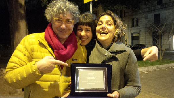 In apertura di notizia potete apprezzare un dettaglio della targa che è stata consegnata a Soldi, mentre, qui di seguito, vedete il regista – giustamente soddisfatto per l’importante riconoscimento ricevuto e per aver portato un po’ di fumetto in un ambito insolito e prestigioso come quello dei Nastri d’Argento – festeggiare, targa in mano, in compagnia della montatrice Silvia Di Domenico e dell’assistente Francesca Tomassini. Per godervi il trailer di “Nessuno Siamo Perfetti“, visualizzate il trailer del film sulla nostra pagina YouTube.