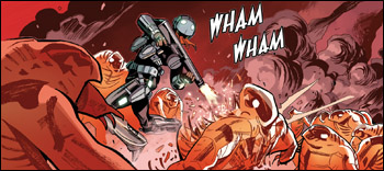 EM: Orfani è la storia che avremmo sempre voluto leggere: dentro c’è “Halo“, come c’è “Fanteria dello spazio” (il libro, non il film), “Alien“, “Metal Gear Solid” e tutto l’immaginario visivo di fantascienza bellica che adoriamo. Riferimenti a fumetti ce ne sono pochi, anche se un personaggio indossa un casco che è un voluto rimando al Rocketeer di Dave Stevens.