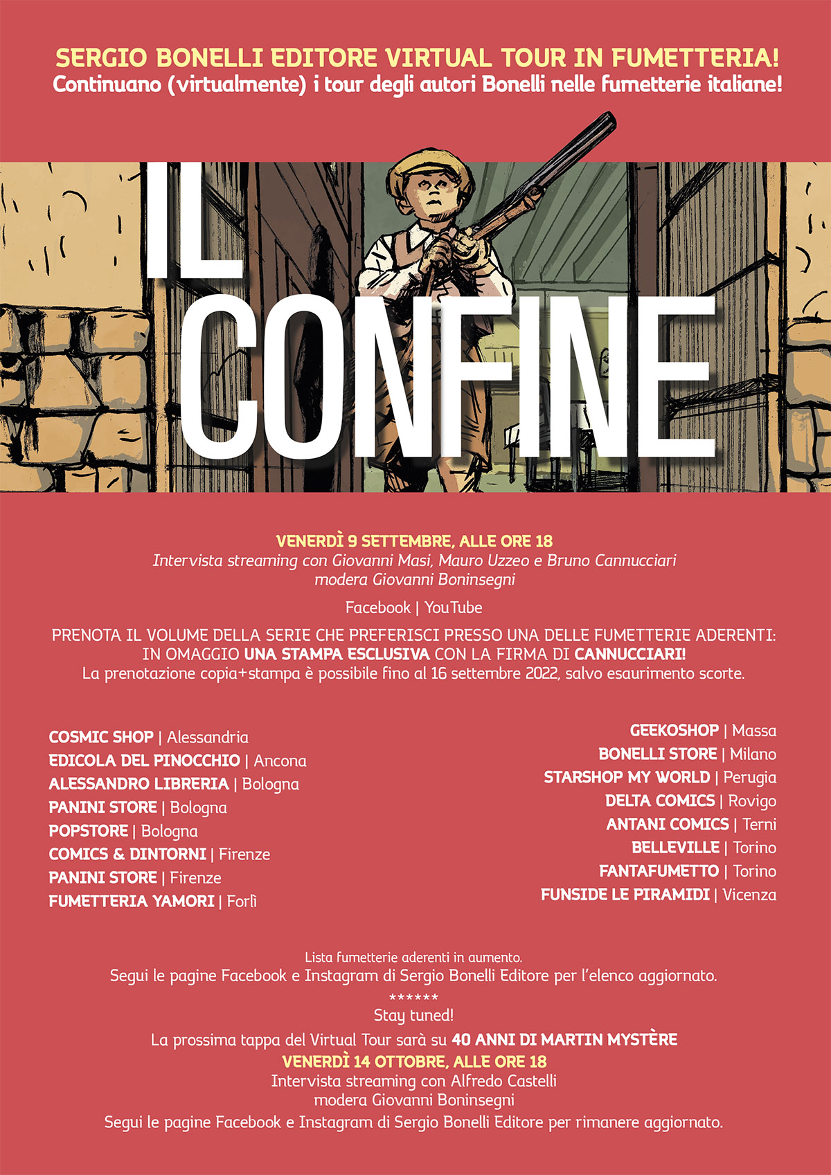 Sulle pagine di Preview #82 trovate anche la lista delle fumetterie che aderiscono al nostro Virtual Tour Fumetterie per la tappa dedicata a Il Confine, in attesa dell’uscita del nono volume. I lettori hanno infatti la possibilità di prenotare il volume che preferiscono tra quelli finora usciti entro il 16 settembre presso le librerie aderenti per ottenere in omaggio una stampa esclusiva firmata da Bruno Cannucciari, e a cui è collegata la videointervista allo stesso Cannucciari e a Mauro Uzzeo e Giovanni Masi che diffonderemo sui nostri canali venerdì 9 settembre.