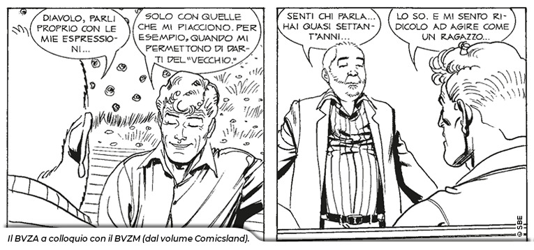 Ho chiesto dunque di affidare queste righe a un personaggio che ha seguito il BVZM per più di chiunque altro a parte me, e cioè il mysterioso Carlo Recagno. L’aggettivo non fa riferimento al suo rapporto con il Buon Vecchio Zio Marty: è proprio mysterioso di per se stesso. Cosa c’è nell’inseparabile borsa che porta con sé? Come mai in venti e passa anni nessuno l’ha mai visto spettinato o con la barba non perfettamente rasata? Perché, come Martin Mystère, invecchia molto lentamente? Esistono altri mysteri che scoprirete nella tavola in stile “Corriere dei Piccoli” disegnata dal famoso “Pitore di Santini” una quindicina di anni fa e inserita nella gallery a fondo pagina. Vi sono citate persone che purtroppo non sono più tra noi e che ricordiamo con affetto.
