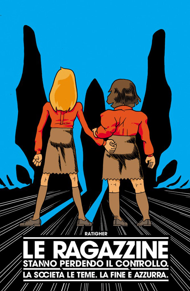 Gli anni delle auto produzioni mi hanno permesso di conoscere bene tutti i processi della lavorazione di un fumetto, in modo particolare quelli relativi a impaginazione e stampa che io considero parte integrante dell’Opera. Per questi miei trascorsi ho deciso di pubblicare il mio secondo libro con una formula che ho chiamato primaomai, una sorta di print on demand a scadenza, che mi permettesse di occuparmi di tutti gli aspetti del libro e di guadagnare in maniera consona. Il mio secondo libro si intitola “Le Ragazzine stanno perdendo il controllo. La società le teme. La fine è azzurra”, un titolo lunghissimo che non avrebbero mai accettato in una casa editrice. Questa storia di ragazzine pre adolescenti mi ha dato grandi soddisfazioni, culminate con la vittoria come Miglior Libro ai Premi Micheluzzi del Napoli Comicon, che mai era andato a un opera autoprodotta.
