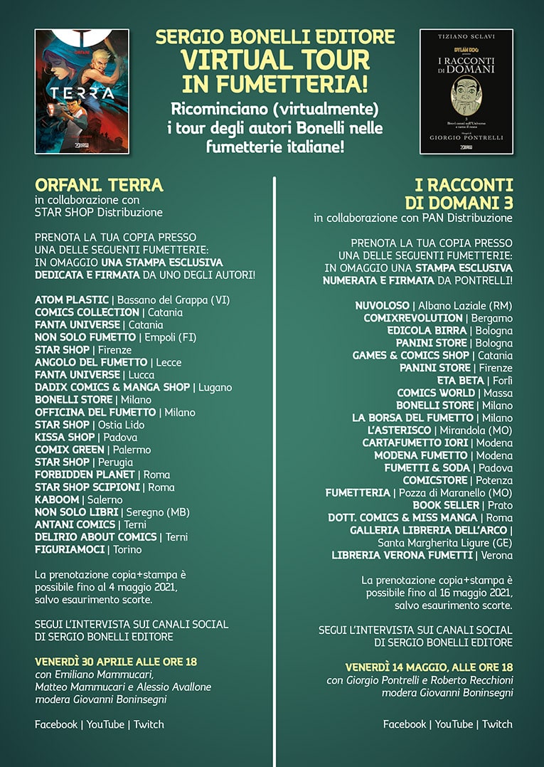 Il primo appuntamento, realizzato con la collaborazione di Star Shop Distribuzione, prevede un incontro con Emiliano Mammucari, Matteo Mammucari e Alessio Avallone andare in onda nei nostri canali YouTube e Facebook venerdì 30 aprile alle ore 18:00. Per ottenere la copia di Orfani. Terra con la stampa autografata e dedicata bisogna prenotarla in fumetteria entro martedì 4 maggio (salvo esaurimento scorte).