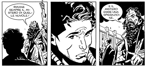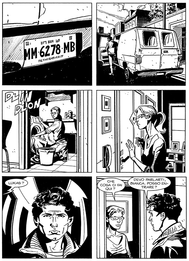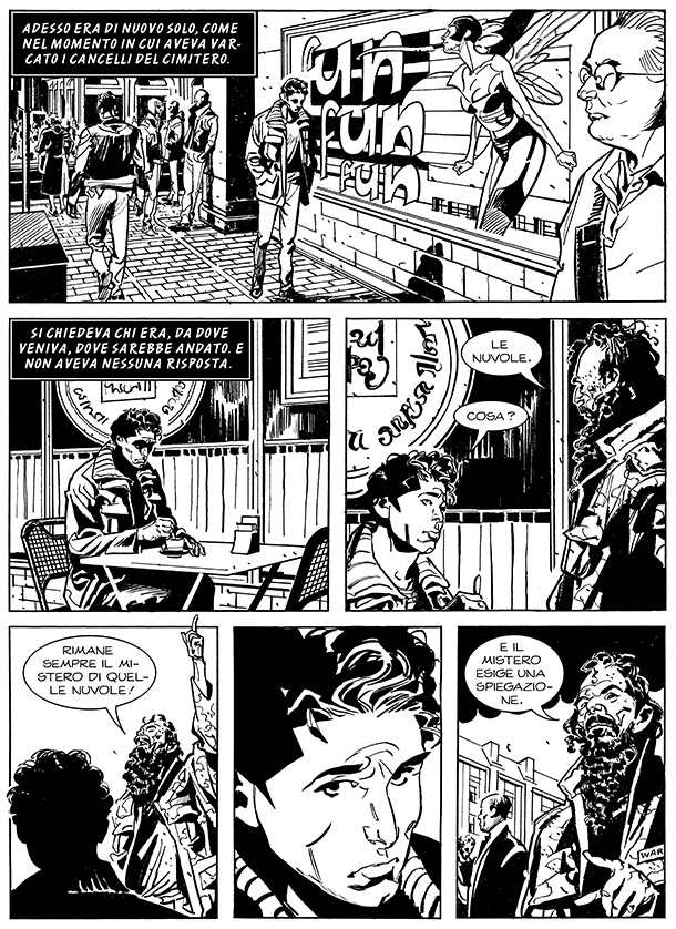 2) A pagina 14, appare nell’albo il barbone Schedel. Schedel era già comparso, passando inosservato, nella prima vignetta di pagina 7 del numero 1 e – divertitevi a scovarlo! – in quasi tutti gli albi, ma rimane una presenza muta ed enigmatica. Questa è l’unica volta in cui Schedel parla e interagisce con Lukas. La sua presenza nella serie è uno scherzo di Michele Medda: il “mistero delle nuvole” che ossessiona il senzatetto è un riferimento ironico alla precedente miniserie scritta da Medda, Caravan, e in particolare alle lunghe discussioni tra i lettori scatenate dal finale della serie.