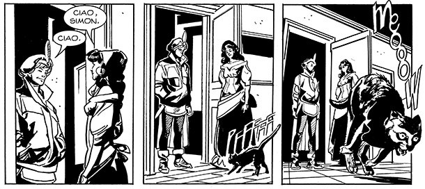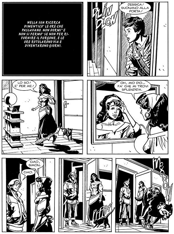 4) A pagina 26, Jessica apre la porta al suo corteggiatore, Simon, e la gatta Lulù scappa terrorizzata alla vista del ragazzo. Un attimo dopo Simon, (fintamente) perplesso, commenta: “Neanche mi fossi travestito da cane…” A una prima lettura è impossibile capire il motivo della fuga della gatta, e quindi cogliere l’ironia della scena. Infatti, il lettore scoprirà solo in seguito le vere fattezze di Simon, e cioè quelle di un orrido ibrido uomo-topo. Il quale, a sua volta, vedrà materializzarsi il suo incubo peggiore nel finale della storia, grazie all’ennesimo twist ironico degli autori.