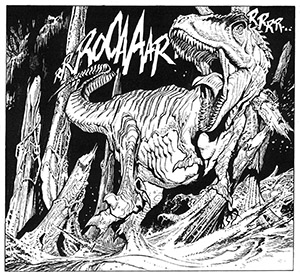 Perciò, ed è questa una delle novità di questa storia, dovendo rappresentare dinosauri del Sudamerica, io e Rubini non abbiamo utilizzato gli abusati Triceratopi, T-Rex e compagnia (che abitavano le regioni dell’attuale America del Nord, dove ci fu un boom di scoperte ottocentesche), ma, approfittando delle conoscenze odierne, abbiamo messo davanti a Zagor e soci soltanto quelle specie che sono state reperite sul suolo sudamericano e che non hanno proprio niente da invidiare a quelle più note e sfruttate! Troverete dunque, in questa storia, ricreati spettacolarmente e magistralmente da Rubini sulla base dei dati scientifici, giganteschi erbivori come l’Argentinosaurus (nella storia sono detti verssek) e il Saltasaurus loricatus (urrh), feroci e mastodontici carnivori come il Giganotosaurus (lerk) e il Carnotaurus (shrak), pterosauri come il Quetzalcoatlus (nak-wi-tah), cacciatori in branco come l’Austroraptor (riwak) e persino dinosaurini come l’eoraptor (wurp). Ovviamente non potevamo definirli negli albi con i loro nomi scientifici, sarebbe stato un anacronismo: i nomi che avete letto tra parentesi sono nella lingua degli indigeni del luogo, una tribù immaginaria di uomini primitivi, i Detak, che si esprime in una lingua altrettanto immaginaria… Una lingua semplice, che però ha un vocabolario e delle facili regole. Per esempio tak significa amico, tak-tak amici (il plurale si crea raddoppiando); verkehr, pericolo; wana, sacro; ukk, basta, stop; nak, morte; errak, mangiare, kregak, uccidere (i verbi sono sempre all’infinito)… e così via! Le altre parole e frasi vi divertirete a decifrarle da soli, come fanno Zagor e Cico, che per ragioni di sopravvivenza imparano in fretta. Ma se ci riesce Cico, ci riuscirete anche voi!