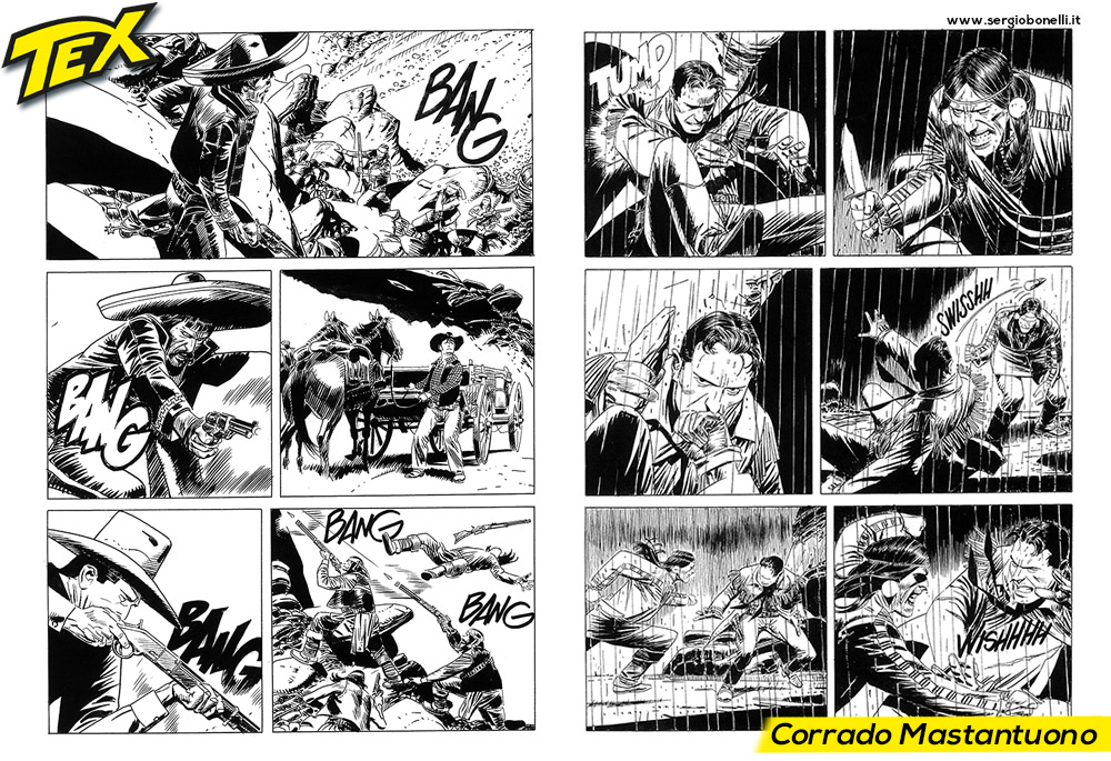 È sbagliato pensare, come ritiene chi non lo conosce o lo legge distrattamente, che Tex sia sempre uguale… La nostra serie preferita non avrebbe avuto il successo strepitoso che riscuote tutt’ora, se Gianluigi Bonelli non avesse posto le condizioni per una grande ricchezza e varietà di temi. L’avventura seguente, sempre scritta da me e disegnata da Corrado Mastantuono, appartiene a quello che potrei chiamare il filone drammatico: dico subito che non ci saranno né bistecche né patatine fritte. Sergio Bonelli ha voluto questa storia negli ultimi mesi di vita e aveva fatto in tempo a leggerne il soggetto e ad ammirarne le prime pagine. Mi aveva chiesto, per i pennelli vigorosi e drammatici di Mastantuono, un’avventura ricca di suspense che ricalcasse un po’ le atmosfere, da lui molto amate, del film “The Missing”, di Ron Howard.