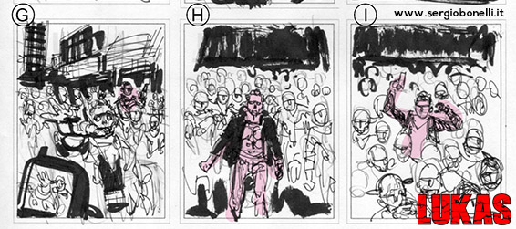 Come al solito cerco di fornire a Michele Medda e alla redazione una rosa di 9 alternative. O anche più. In questo caso la prescelta è stata la “G”, anche se non mi sarebbe dispiaciuto disegnare la “H” con Lukas Zombie e un lontano riferimento al “Quarto Stato” di Pellizza da Volpedo (vi ricorda niente?).