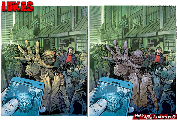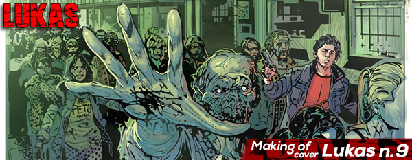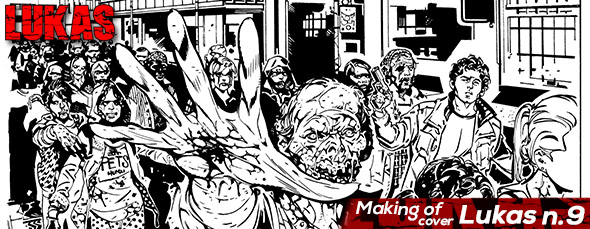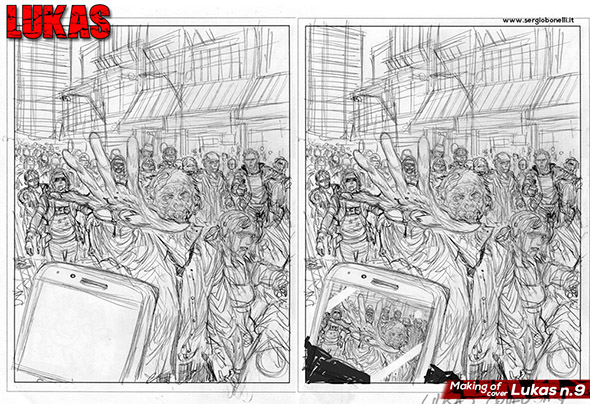 Scelta la cover, ho realizzato la matita dopo una lunga ricerca iconografica sulle “zombie walk”. Volevo rimarcare l’idea di un flusso di gente, “interrotto” da Lukas e dallo zombie in primo piano. L’idea del cellulare in PP deriva da una sequenza della storia, e stop… no Spoiler.