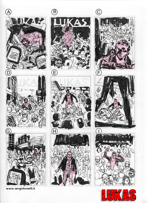 Come al solito cerco di fornire a Michele Medda e alla redazione una rosa di 9 alternative. O anche più. In questo caso la prescelta è stata la “G”, anche se non mi sarebbe dispiaciuto disegnare la “H” con Lukas Zombie e un lontano riferimento al “Quarto Stato” di Pellizza da Volpedo (vi ricorda niente?).