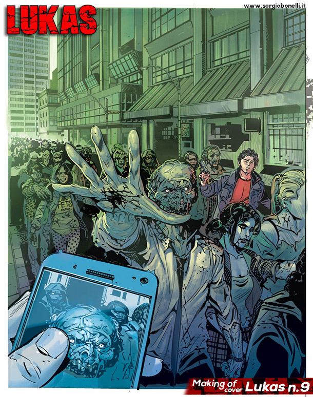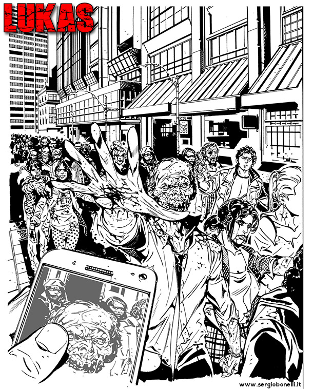 Scelta la cover, ho realizzato la matita dopo una lunga ricerca iconografica sulle “zombie walk”. Volevo rimarcare l’idea di un flusso di gente, “interrotto” da Lukas e dallo zombie in primo piano. L’idea del cellulare in PP deriva da una sequenza della storia, e stop… no Spoiler.