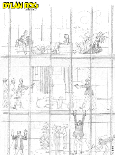 Inizialmente, avevo proposto a Paolo Bacilieri di elaborare la vista di un palazzo modernista, sulla quale muovere Dylan Dog in varie pose e inquadrature, tra interno ed esterno. Paolo ha scelto una facciata completamente trasparente che, nella struttura, rimanda alla griglia fumettistica, all'interno della quale agiscono i vari Old Boy ai quali Giuseppe Montanari ha donato la sua consueta fisionomia, caratterizzata come sempre da una sintesi tanto efficace quanto efferata. Infine, Vincenzo Filosa ha illuminato il tutto con una colorazione livida e spettrale.