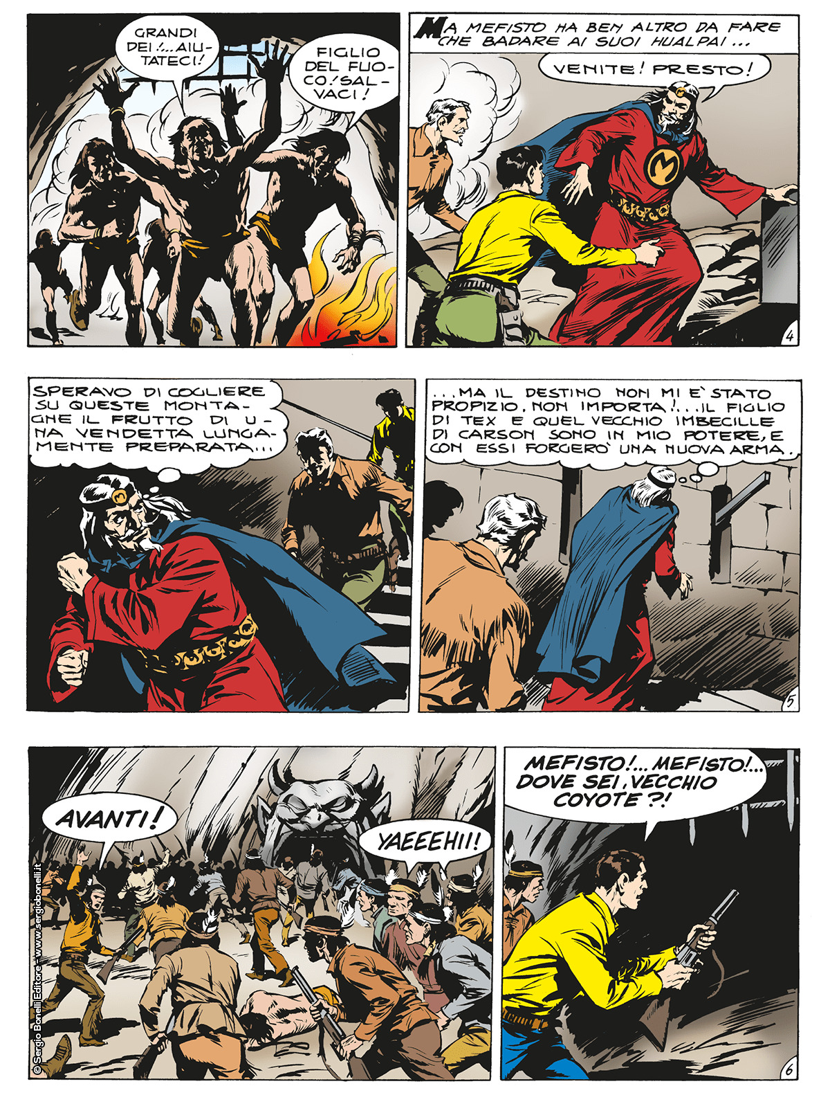 Hunting for his arch-enemy, Mefisto, who kidnapped his son Kit and his pardner Carson, Tex find his lair, an obscure fortress carved in the Rainbow Mountain rocks. With the help of his Navajo warriors led by Tiger Jack, the Ranger conquers it. Even if our heroes defeat the army of Hualpai Indians at the sorcerer’s service, the diabolical wizard manages to escape with his precious hostages, hypnotized by the darkest of his magical arts. Determined to persist, Tex continues his hunting for months, not knowing that Mefisto uses his control of Kit and Carson for a series of robberies. After that, the sorcerer deceives the two Rangers and leaves them in the middle of the desert without water, dooming them to a slow agony…