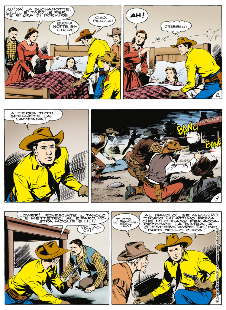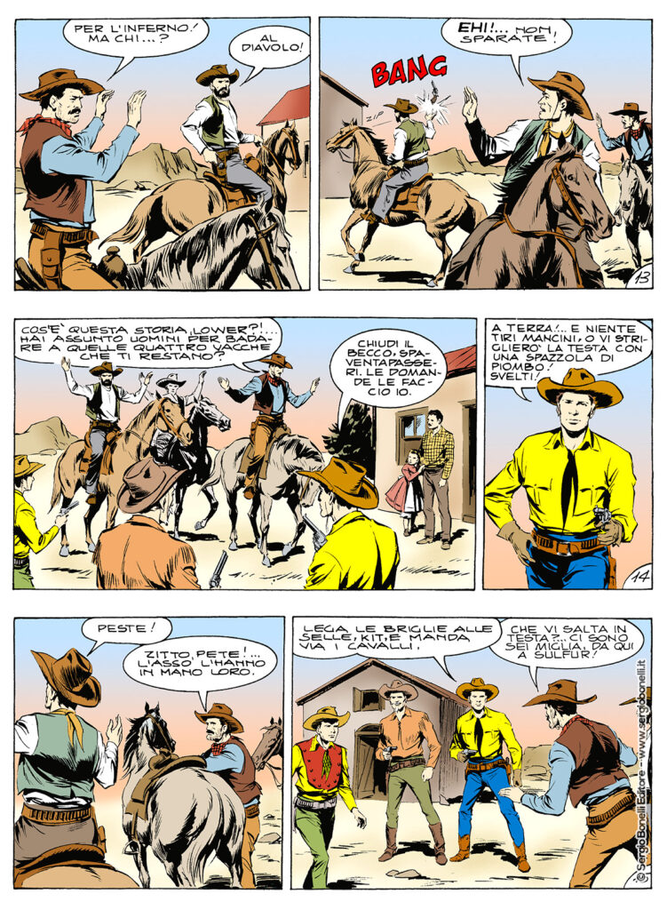 Looking for the instigator of the malicious attack that let Carson injured, Kit & Tex, along with Cederville mayor, stumble upon a mysterious farm protected by a barbed wire trench and many gunmen. Trying to shed some light upon the situation, our heroes ask the farm owner, Mayor Bartell, to make an accurate survey of his land. Bartell makes a show of being willing to help, but while they are having a drink in the local saloon, Tex barely escapes death: someone poisoned his whiskey, but an old drunkard gulped it unwittingly and almost immediately fell dead. Tired of being targeted, the pardners begin to attack, and end up thwarting the plans of a gang of horse thieves that had targeted Mr. Bartell’s farm…