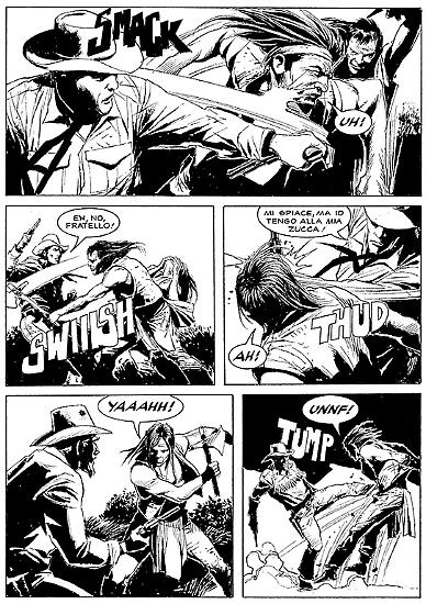 Anche in "Furia comanche" (Tex 645) abbiamo un antagonista avvolto da un alone di leggenda, in effetti. Un ribelle indiano sopravvissuto alla impiccagione, che tutti, compreso lui stesso, credono immortale. Il guerriero che non teme la morte può essere un avversario terribile per chiunque, e Wasape darà parecchio filo da torcere all'esercito, e perfino al nostro Tex, prima che venga svelato il segreto della sua invulnerabilità. Ma non anticipiamo troppo... Le meravigliose tavole di Ernesto Garcia Seijas meritano di essere gustate una per una, al momento giusto.