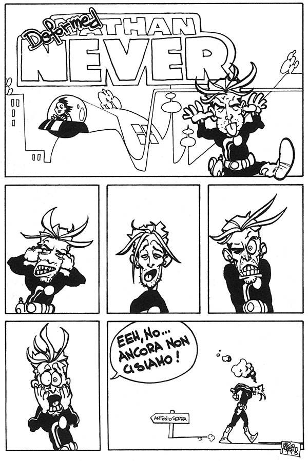In pratica, sto cercando di disegnare quanto più possibile "alla prima", senza passaggi intermedi, e il computer con i suoi infiniti "undo" mi permette di provarci senza buttare tonnellate di carta e mesi su una sola tavola per rifare ogni volta tutto da capo. È un "alla prima" che alle volte diviene un "alla centesima", ma il punto è che non è mai un ripasso. Questa spiegazione, come forse avrete intuito, non è che un modo arzigogolato per dire che sono un insicuro cronico e che l'"undo" è il mio tranquillante.