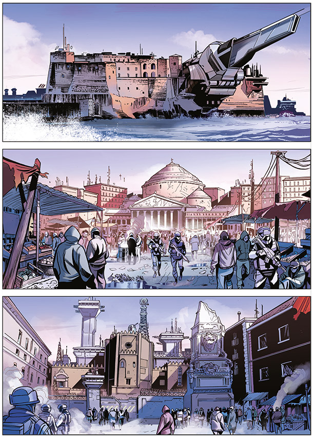![]() Napoli, Piazza del Plebiscito nel futuro distopico di Orfani: Ringo. (cliccate sull'immagine per visualizzare la tavola intera) |
