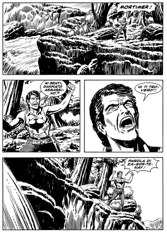 ![]() Uno Zagor sconvolto giura vendetta a Mortimer. Da "Vendetta trasversale" albo n.591 (cliccate sull'immagine per visualizzare la tavola intera) |