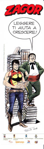 È stata un’iniziativa bellissima: fu scelto proprio Zagor come testimonial per il nuovo sistema informatizzato del circuito bibliotecario della Provincia di Ragusa, nel 2008. Realizzai un paio di illustrazioni che accompagnarono segnalibri e locandine distribuiti nelle scuole, coinvolte in primis nell’iniziativa. Un momento importante era proprio un incontro pubblico con i ragazzi, piccoli e grandi, delle scuole di Ragusa e che prevedeva la presenza, contemporaneamente, di più di 700 alunni. Colto dal panico, chiesi aiuto all’unica persona che conosco in grado di tenere testa ad un simile esercito: Moreno Burattini! Il giorno dell’incontro, Moreno intrattenne la platea per circa un’ora e mezza, parlando di fumetti e dell’iter lavorativo che c’è dietro la realizzazione di un albo. Fu incredibile. Tutti i docenti si complimentarono per come seppe tenere alta l’attenzione in un pubblico di giovanissimi, impresa notoriamente non semplicissima.