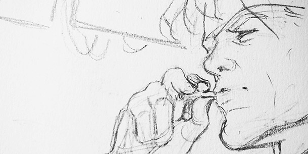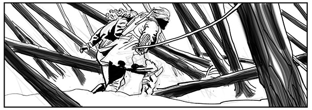 Ciò che a me preme è la scelta delle inquadrature all’interno delle singole vignette e soprattutto il legame che si sviluppa tra di loro. Mi piace concentrarmi sulla concatenazione narrativa, cercando di creare insieme allo sceneggiatore una pista impalpabile che guida il lettore e gli consente quasi di calarsi negli ambienti a fianco dei personaggi.