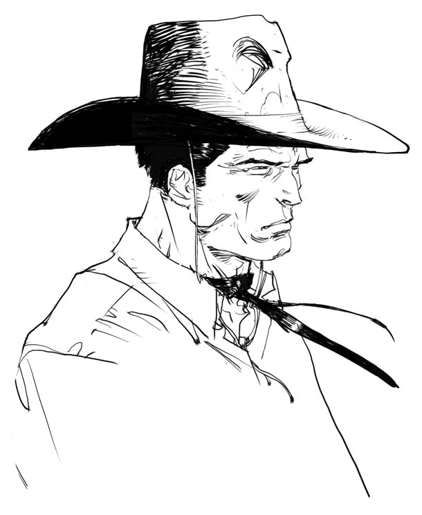 I nomi sul piatto erano molti, ma ci serviva un autore che avesse dimestichezza con il formato e lo stile grafico che volevamo per questi albi. Il Direttore Editoriale Mauro Marcheselli ha proposto Mario Alberti e io ho subito colto la palla al balzo, pur con qualche perplessità. Pur apprezzando i suoi lavori di genere Fantasy e di Fantascienza, non avevo idea di come Mario si sarebbe cimentato con il Western. A dire il vero, non l'aveva neppure lui! Il disegnatore triestino fu al contempo lusingato e intimorito dall'idea di affrontare questo nuovo e inedito compito. Cercai di metterlo subito a suo agio e, da grande professionista qual è, già il giorno dopo mi inviò uno splendido ritratto del Ranger (lo potete ammirare qui di seguito, NdR).