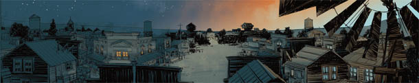 Il formato più grande offre la possibilità di sfruttare un linguaggio grafico diverso, uscendo dalla tradizionale gabbia a tre strisce. Non solo consente un ritmo narrativo diverso, più scattante e concentrato, ma la scansione delle vignette e la lettura grafica della tavola sono più movimentate e offrono maggiore spazio a diverse soluzioni creative. Mi ha divertito molto studiare le precedenti pubblicazioni di Alberti per scrivergli, di conseguenza, una sceneggiatura "ad hoc", con layout predefiniti e un'impostazione delle vignette "alla francese". Degli esempi evidenti si ritrovano in una sequenza raccontata attraverso un paginone doppio, con un'epica cavalcata verso il Rio Grande, e nelle pagine 28 e 29 del volume (presentate in anteprima nella nostra gallery, NdR) in cui la notte trascolora nel giorno sopra la città di Austin, oltre che in altre trovate grafico/narrative che ci siamo divertiti a imbastire.