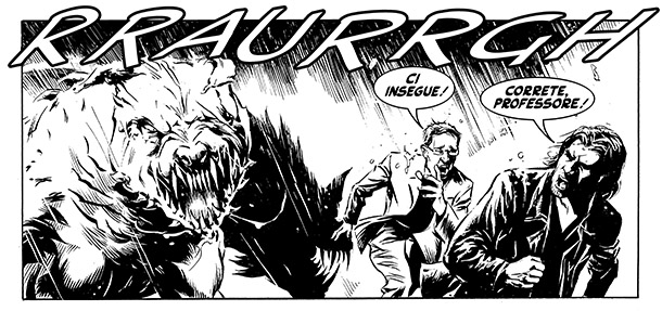 È necessario precisare un dato importante: l'avventura non prevedeva di esplorare tutta l'ambientazione creata da Dante (quindi non ogni singolo girone infernale con relative sotto-categorie di dannati), ma solo la parte utile alla narrazione (per fortuna e purtroppo), e di non fornire una rappresentazione esaustiva dell'Inferno dantesco: se si fosse voluto mostrare per intero non sarebbero bastati DUE numeri speciali! Io e te, Moreno, abbiamo sempre ponderato assieme come far funzionare le cose, e pur essendovi molti scenari fra cui scegliere, alcune delle tappe erano obbligate e quelle mostrate, nel complesso, mi paiono tutt'ora la scelta migliore. Durante la lavorazione, pur dovendo aderire alle descrizioni che Dante diede in particolare delle creature, mi è stato permesso di spaziare, nel rispetto dell'immaginazione del poeta, sfruttando quel che riguarda il “non detto” da Dante. Uno degli esempi più estremi e difficoltosi di iconografia (assieme all'abisso con la cascata di sangue) riguarda l'ideazione del cane demoniaco Cerbero (di cui esistono mille versioni); la storia rendeva ulteriormente arduo il tutto, poiché l'essere aveva ogni parte del corpo in movimento in una diversa direzione per attaccare ferocemente i dannati... Il risultato è un demone che pur rispettando l'allegoria voluta da Dante (tre teste diverse che si riferiscono a tre diversi aspetti del peccato di Gola), ha anche caratteristiche del Cerbero dell'Eneide di Virgilio, con strizzate d'occhio a creature dei film e dei manuali dei mostri; spero di essere riuscito a trasmettere la ferocia e il terrore che il demone dovrebbe provocare.