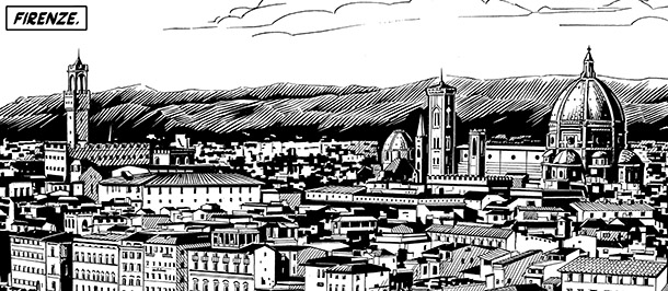Le due principali ambientazioni necessitavano di una differenziazione stilistica, ma con qualche aspetto comune, di modo da potersi fondere all'occorrenza. Utilizzare nelle tavole infernali lo stesso tratto di quelle di ambientazione toscana avrebbe tolto cupezza e atmosfera... trovare una chiosa e un equilibrio non è stato immediato. Per quel che concerne invece la rappresentazione della città di Firenze, che già conoscevo e a cui sono legato anche per altri motivi, ho iniziato documentandomi attraverso il web per poi finire col recarmi in loco a fotografare e vivere i posti di persona (compresi i tetti, per quel poco che ho potuto); è vero che già altre storie di Dampyr sono state ambientate in Italia, ma visto il testo di riferimento e sfruttando le richieste della sceneggiatura, ho deciso di mostrare nelle pagine iniziali una Firenze reale, solare, per dare ingannevolmente l'apparenza che una città del nostro Paese non possa essere “colpita” da nulla di sovrannaturale, per poi calare lentamente il capoluogo toscano nell'atmosfera oscura della storia, così come i protagonisti si addentrano progressivamente nelle profondità infernali. La cupezza in Firenze parte dagli interni solo all'inizio dell'indagine di Dampyr, e contamina poi il resto della città nella notte, via via che i personaggi entrano in contatto con l'elemento scatenante dell'apertura della “Porta Infernale”.