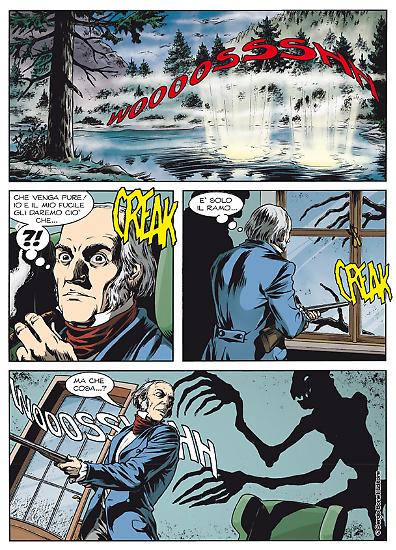 Per quanto riguarda l'horror, io scrivo e leggo di tutto, ma ho una predilezione per l'horror. In ambito bonelliano, oltre a Zagor sono stato un grande lettore di Dylan Dog, acquistato in edicola fin dall'ormai mitologico numero uno. In Zagor ho sempre amato moltissimo il connubio inedito fra horror, avventura e comicità tipico di alcune storie di Nolitta (Rakosi, Kandrax...), e poi ripreso anni dopo da alcune storie di Mauro Boselli e di Moreno Burattini. La mia storia precedente è molto pulp e del tutto priva di elementi sovrannaturali. Questa volta desideravo scrivere un "horror zagoriano", quella particolare alchimia nolittiana di porte che cigolano, ombre sinistre, creature mostruose in agguato, e, all'improvviso... spunta fuori Cico che ribalta la situazione con una delle sue azioni improbabili! Il tutto rispettando l'epicità zagoriana, sia dello Spirito con la Scure, sia dei suoi nemici. È molto difficile mantenere l'equilibrio fra l'atmosfera horror, la comicità di Cico, e l'epicità di Zagor.
