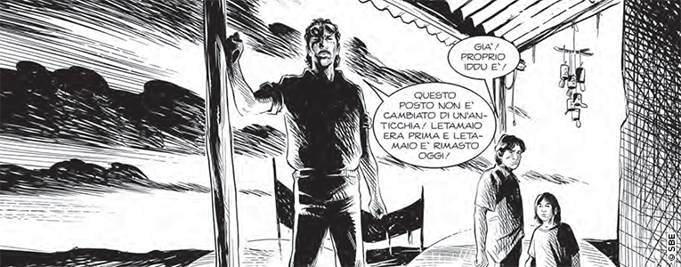 Dato che non c'è una cesura precisa tra sogno e realtà, era necessario che lo stile grafico differenziasse nettamente i due piani temporali. È un po' come se un film a colori diventasse in bianco e nero, è un modo per staccare la narrazione. All'inizio avevo anche pensato che ogni flashback avrebbe potuto avere uno stile diverso, unico: uno in linea chiara, uno finto graffiato... Ma poi si è deciso di fare diversamente e abbiamo dato a tutti lo stesso stile.