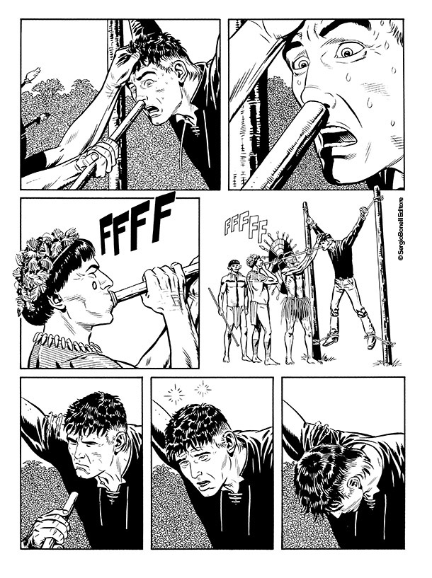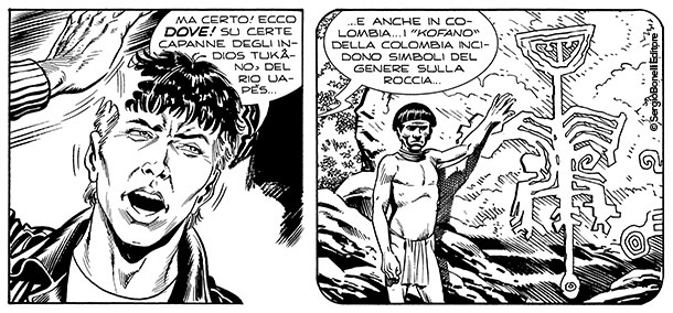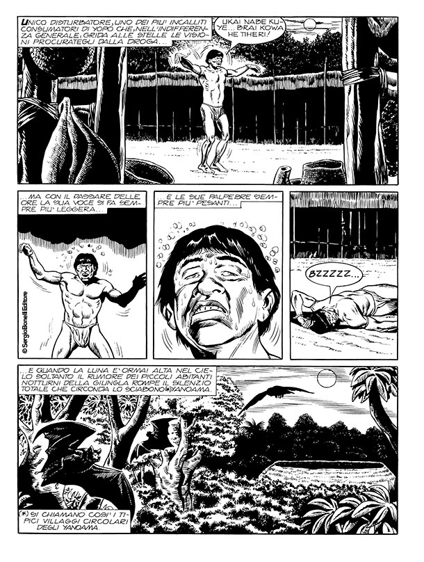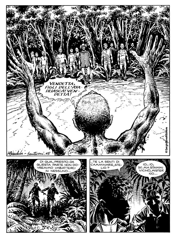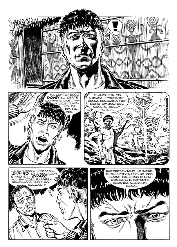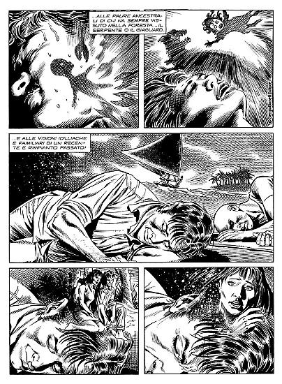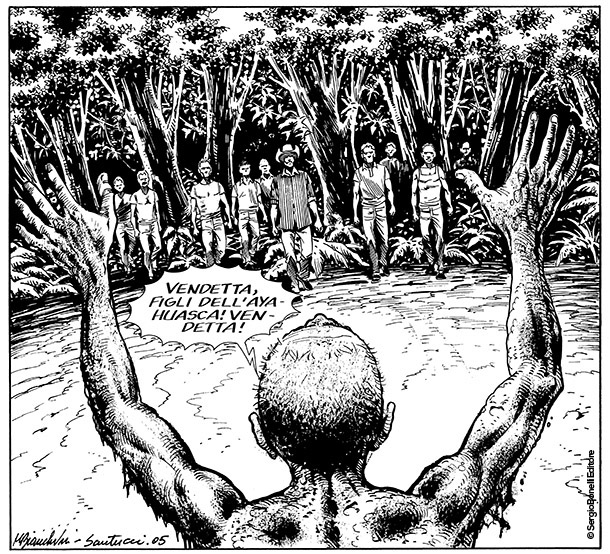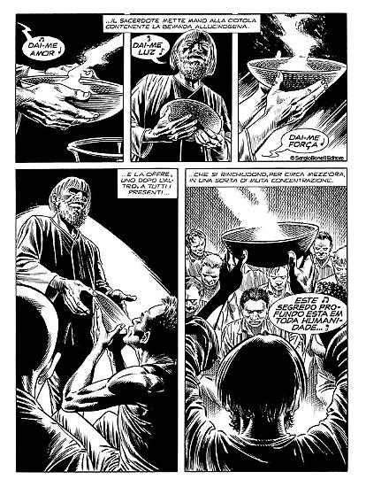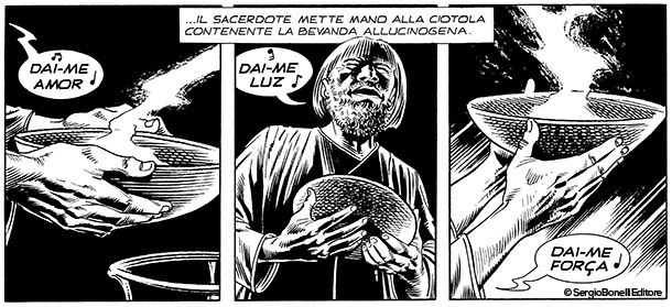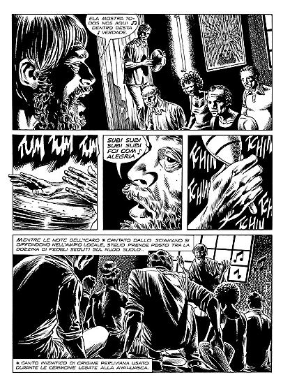 Alla fine fu il vostro Mister No a tirarlo fuori. Conoscevo le visioni provocate dalla droga per averle viste dipinte sulle capanne degli indios Tukâno, sul Rio Uapés, e incisi sulle rocce dei Kofano in Colombia, dei Jivaro in Perù e degli Zaparo in Ecuador. Quando notai certi disegni dello stesso tipo nella baracca di Stelio alla periferia di Manaus capii subito che cosa li aveva ispirati. Ficcai il naso un po' in giro e arrivai alla Casa das Sapucaias in tempo per salvare Stelio da un marcantonio che stava per fargli la pelle. Ci fu un po' di parapiglia e il "tempio" finì per andare a fuoco insieme a Mestre Raimundo, che pronunciò la sua ultima maledizione prima di andarsene nell'inferno che aveva creato in terra per tanti suoi adepti ingenui e fragili come il mio amico Stelio.